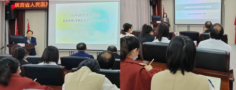 白俊主任强调,随着肿瘤发病的逐年升高,基层医院肿瘤救治压力增大,通过组团式帮扶,希望加强两院肿瘤学科交流协作,提升镇安县医院肿瘤诊治水平,使镇安县肿瘤患者在家门口就能享受肿瘤专科规范化诊治。何莉护士长表示,通过两院对口帮扶,提高肿瘤专科护理能力,培养肿瘤专科护理人才,与医疗组共进步。随后,白俊主任和何莉护士长分别做了题为“从中美指南差异看EGFR-TKI辅助治疗的价值”、“肿瘤患者营养评估与患者教育”的讲座,围绕肺癌辅助靶项治疗发展及现状、肿瘤患者营养评估与患者教育、营养误区等内容进行授课,以期提高基层临床医护人员应对肿瘤诊疗和护理中常见问题的能力,加强专科建设。