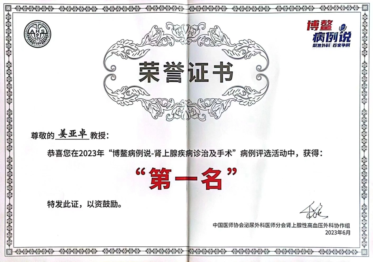 泌尿外科病院姜亚卓主任医师最终获得第一名的好成绩。
