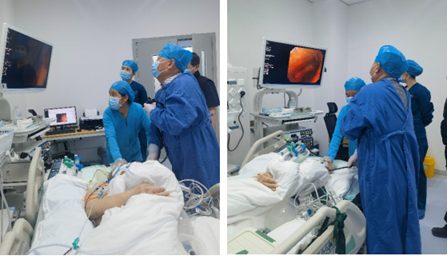 患者为高龄女性,80岁,因大面积脑梗死于西咸院区急诊科ICU住院。入住时病情危重,意识不清,同时合并肺部感染、低氧血症,住院期间反复出现呼吸暂停,生命体征不平稳。后来患者出现呕血、黑便,合并血红蛋白明显下降,给予药物、输血等治疗后效果不理想。患者于昨日再次出现大量呕血及黑便,诊断为上消化道大出血并失血性休克,病情危急,如不及时使患者消化道出血停止,则患者随时有生命危险。在这样的紧急关头,为患者实施胃镜检查,找到出血病因是一条非常重要的抢救措施。