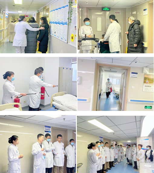 在李建辉主任的一声令下中应急演练全面展开。护士在发现“火情”后立即示警,报告科主任及护士长现场情况。另一名护士立即按下消防报警按钮,并打开病区大门,拨打院内消防电话进行火情上报。李建辉主任到场指挥下达命令,责任护士将被困于病房的患者进行疏散;部分在岗医护人员就近打开消防设备,使用灭火器对起火处进行灭火;其余人员在张颖护士长的带领下维持病区秩序及安抚其他患者的情绪,组织在场人员用湿毛巾捂住口鼻,贴墙弯腰快速疏散。最后,医护患所有成员安全有序撤离,演练圆满成功。