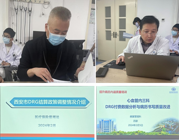 培训会上,张亚军副处长介绍了2024年西安市医保DRG付费政策调整以及DRG付费政策对医院带来的影响和重要性。韦新刚副处长对医院和心内三科2023年度医保DRG运营分析数据、病组结算结果及疾病权重组占比等作出详细解读。张可副主任科员对医保基金监管违规问题进行介绍。之后,吕歆医师对医保DRG运行病历中影响DRG分组主要问题进行分析和解读,并提出了具体改进措施。专题讲座后,医保处及病案管理科现场为心内三科医护答疑解惑,解答新政策下三级片