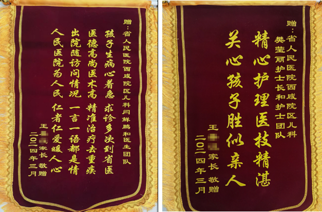 在治疗1周后,患儿入院时症状有所好转,2周后各项症状基本消失,复查胸部CT显示肺部炎症较前明显吸收。出院后,医护团队继续电话随访,指导病情观察和护理,复查胸部CT示未见明显异常。家长分别给医生团队和护理团队送来了锦旗,对三级片
