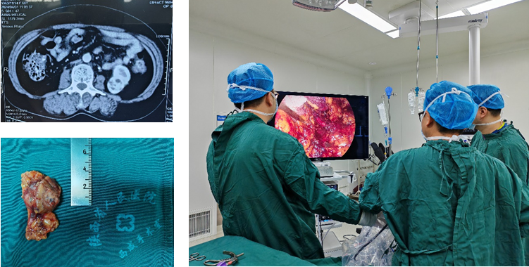 西咸院区移植泌尿外科就诊。为了进一步明确诊断,患者住院后随即完善了各项相关检查,结合患者病史、症状、辅助检查分析,经过科室充分讨论,一致认为目前该患者肿瘤位于左肾下极,考虑肾癌可能性大,肿瘤大小约4cm,可行后腹腔镜左肿瘤剜除术。李智斌副主任介绍道,腹腔镜保留肾单位手术已经代替开放手术成为局限性肾癌手术的主要方式之一,通过阻断肾动脉,使肾脏处于缺血状态,并且在半小时内把肿瘤剜除并缝合,最大程度地保留患肾功能,手术微创损伤小,利于患者恢复。在麻醉科、手术室的配合下,李智斌副主任及阮东丽副主任医师、陈波朋医生为患者顺利施行4K腹腔镜下肾肿瘤剜除术,手术顺利,术中阻断20分钟,完整剜除肿瘤并缝合创面,术后患者安返病房。