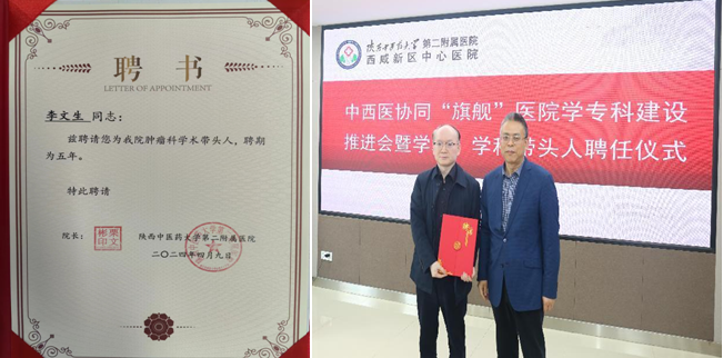 4月11日下午,陕西中医药大学第二附属医院举办中西医协同“旗舰”医院专科建设推荐会暨学术、学科带头人聘任仪式,医院党政领导班子及13位聘任教授参会。三级片 病理科李文生主任受邀参会,并被聘任为陕中二附院肿瘤学术带头人。