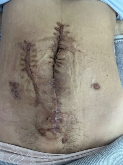 患者为33岁年轻女性,此前因孕期急性肠梗阻行剖宫产+小肠部分切除术、回肠单腔造口术及回肠造口还纳术。后期术区有明显瘢痕增生,并反复出现瘢痕破溃,多家医院就诊,溃烂部位未愈合。近日因部分瘢痕明显红肿、破溃,有脓性渗液,遂至三级片
