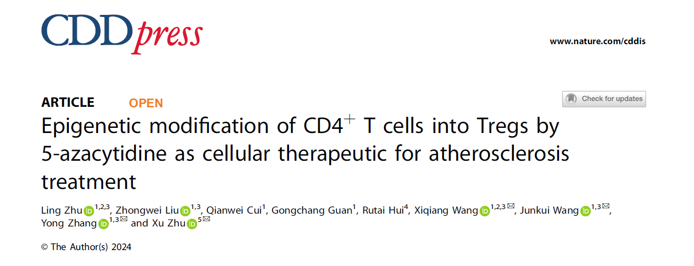 作为第一单位的论文《Epigenetic modification of CD4+ T cells into Tregs by 5-azacytidine as cellular therapeutic for atherosclerosis treatment》被《Cell Death & Disease》杂志接收并在线发表。