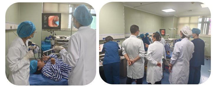 。门诊电子喉镜检查未见明显异常,胸部CT提示右肺中下叶炎症,以“未分化疾病-咯血原因待查”入住全科医学科。患者4年前诊断克罗恩病,长期应用免疫抑制剂英夫利昔单抗治疗。入院经抗感染、止血治疗,患者仍有间断咯血,伴一过性呼吸困难及血氧饱和度降低,时晔、徐博主任团队详细询问病史及认真阅片,患者影像学特点及感染相关指标正常,不支持一般感染性肺炎的诊断,安排第三天复查胸部CT,发现右肺下叶肺不张。结合发病时情况及支气管解剖特点,高度怀疑气管吸入异物,病情紧急,需要尽快支气管镜检查明确右下肺不张病因。此时已临近下班,郭伟主任恰好在病房,及时联系呼吸与危重症一科陈瑞琳主任医师进行会诊,指导值班医生行次日支气管镜检查准备,并和家属充分知情告知检查必要性及可能风险。