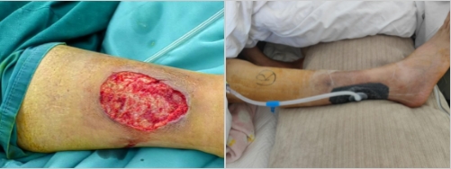 手术由孙正明主任医师主刀,杨波副主任医师、手术室护士赵蓉等人配合完成,患者为中年女性,3周前外伤致右小腿挫伤,在外院行清创缝合术,术后局部皮肤坏死伴染,之后经多次换药清创、抗感染等治疗,疗效不佳,经亲友的介绍就诊骨科(西咸)并以“右小腿创伤后感染伴皮肤坏死”收住院。经骨科(西咸)团队的详细检查、讨论并制定合理手术方案,于今日行“右小腿感染病灶清创+负压吸引术”,该患者目前主要是控制伤口感染并改善局部血运,待感染控制及局部血运情况改善后需进一步行植皮术。