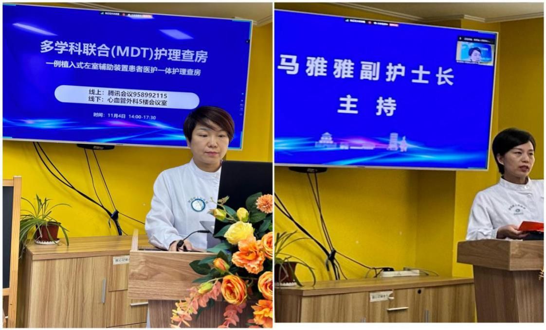 心血管专科实力和竞争力,同时为科室后续开展更复杂、更先进的心血管手术积累了宝贵经验,有助于推动学科的不断发展和完善。然而,LVAD的术后管理却是一项复杂而艰巨的任务,需要医护团队紧密合作,共同制定和执行科学的诊疗护理计划。11月4日下午,在宋宝国主任和李婷护士长的指导下,心血管外科举办“科技创新、焕然心生”—一例植入式LVAD装置手术患者的医护一体多学科(MDT)护理查房活动。