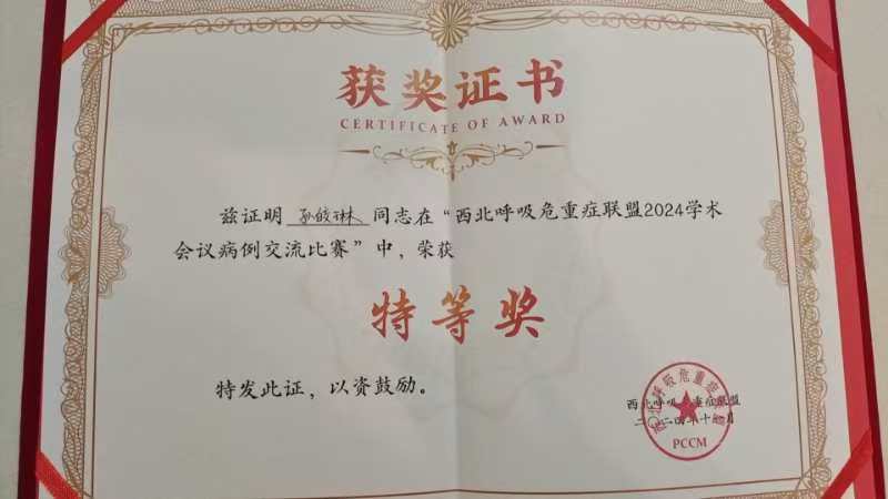 呼吸与危重症医学一科孙皎琳博士以总分第一名的成绩荣获特等奖。