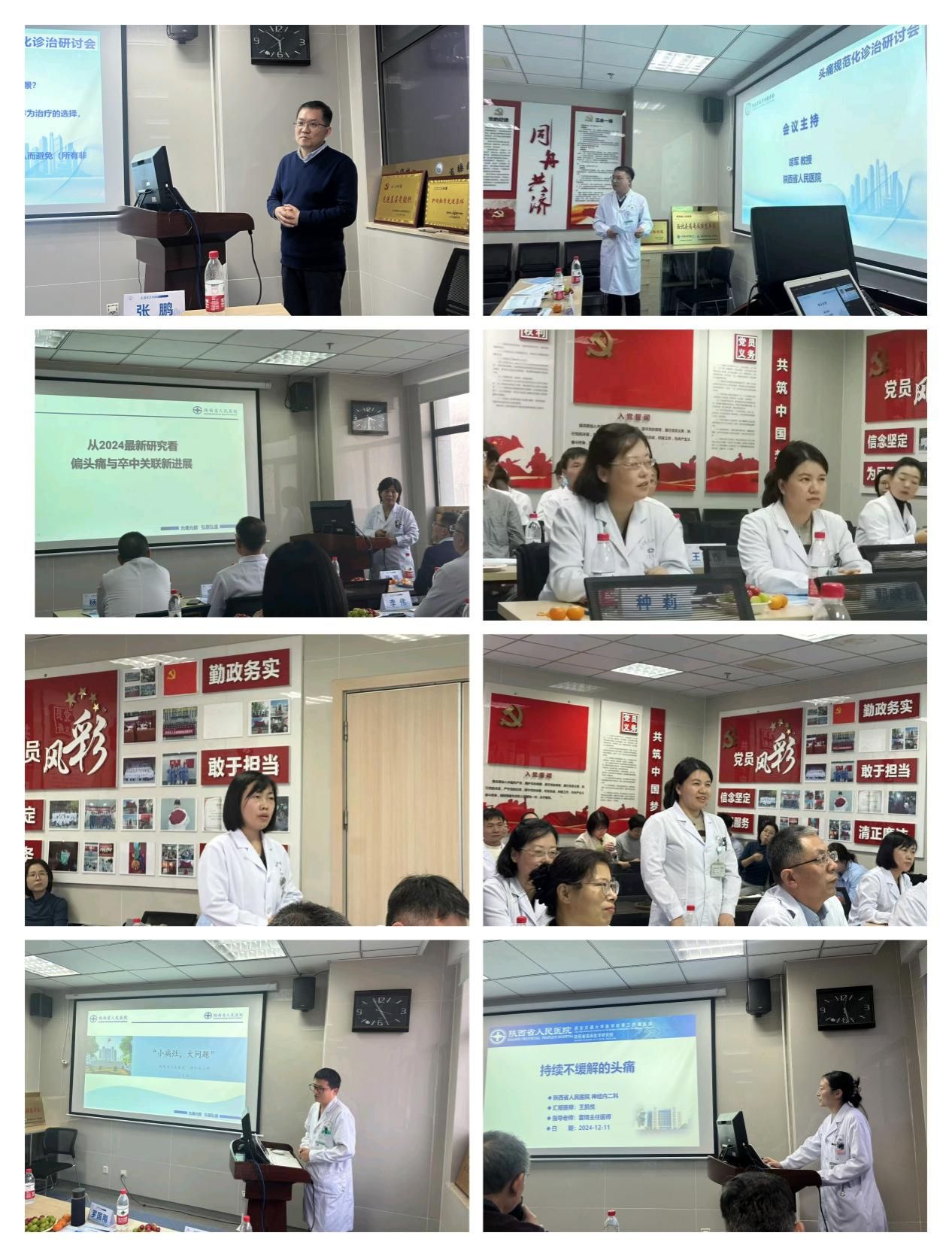 会上,西安交通大学医学院附属第一医院神经内科主任罗国刚教授深入浅出的讲解了《急危重症头痛的早期识别及诊疗思路》,神经内二科雷琦教授解读了《偏头痛的诊治进展》,神经内一科邸伟教授就《从2024最新研究看偏头痛与卒中关联新进展》做了专题报告。在神经内三科李锐教授的主持下,青年医生王沈阳分享了《小病灶、大问题》一例慢性偏头痛合并脑小血管病的诊治过程,王凯悦医生分享了《持续不缓解的头痛》一例复杂特殊类型的蛛网膜下腔出血的诊治过程。神经内二科郭荷娜教授及神经内二科郭晓敏教授分别对上述病例进行了深刻且细致的点评。会议最后,在神经内一科胡军教授的主持下,药学部主任张鹏教授、西安交通大学医学院附属第一医院罗国刚教授、神经内二科郭荷娜教授、神经内三科种莉教授就有关头痛规范诊疗的若干问题进行了热烈的讨论。