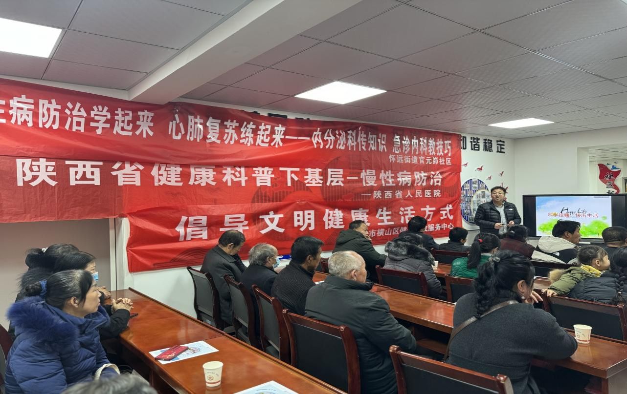 12月17日,内分泌科李辉副主任、吴贵福副主任医师联合急诊内科陈转红护士长及相关医护人员不畏严寒,前往偏远的榆林市横山区仓库湾社区及官元峁社区、清涧县上七里湾社区对其管辖区内共100余名当地居民开展健康科普讲座及安全与应急救护技能演示,重点围绕“糖尿病基础知识、健康饮食、运动锻炼、科学管理”等展开。讲座结束后,急诊内科陈转红护士长等现场对居民进行心肺复苏演示,获得了参加活动的居民一致好评与认可。