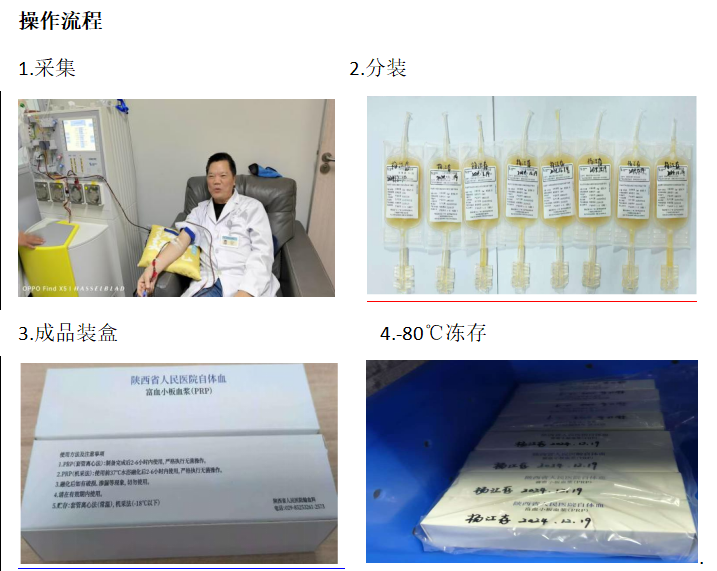 实施过程中,输血科应用血细胞分离机采集制备PRP,采集过程30-40分钟左右,每次可采集50-80ml,分装5-8个小袋,实现了一次采集,多次治疗使用。PRP采集过程顺利,成功分离出浓缩血小板100毫升,用时40分钟,血小板浓度达到1324×109/L(正常浓度×6倍)。采集后在无菌条件下进行分装,冷冻保存于-80℃储血室冰箱备用。