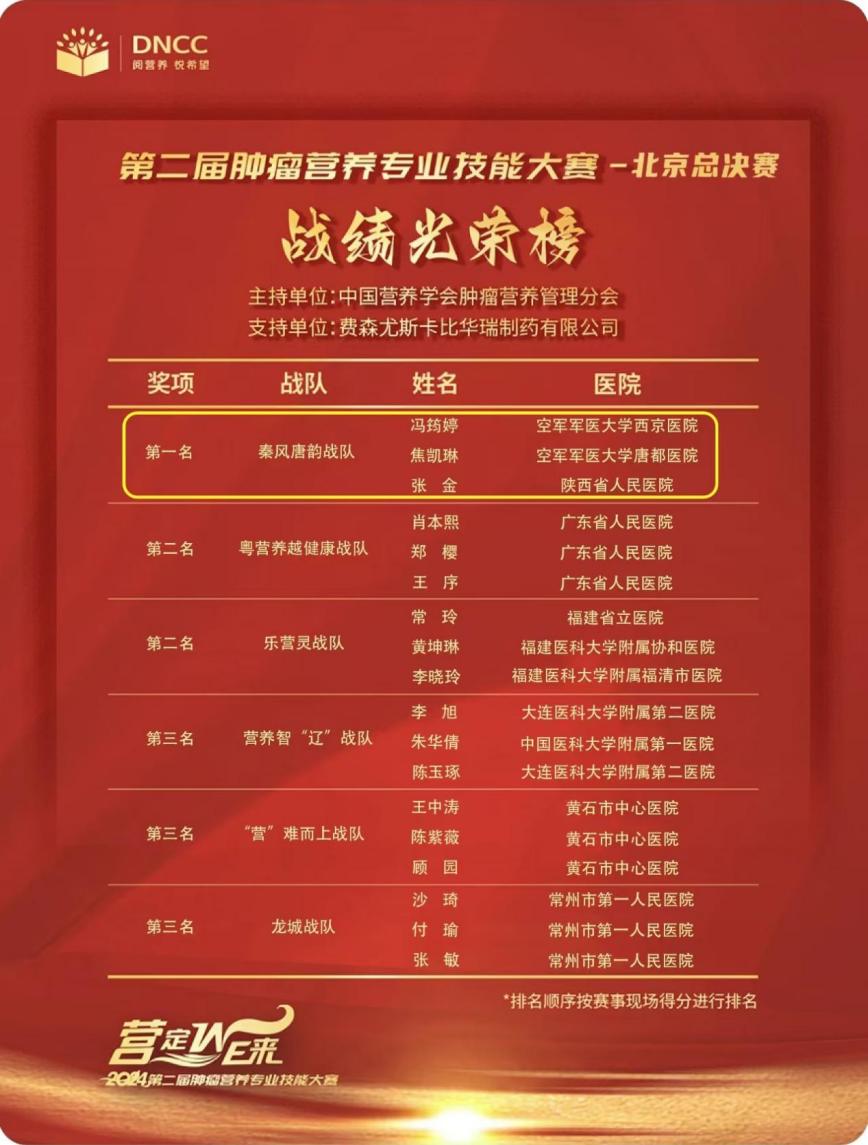 临床营养科张金医师与西京医院冯筠婷医师、唐都医院焦凯琳医师共同组建的“秦风唐韵”战队代表西北地区参赛。团队凭借扎实的专业功底、创新的临床思维和卓越的团队协作能力,从全国众多顶尖医疗机构的参赛队伍中脱颖而出,最终摘得桂冠!