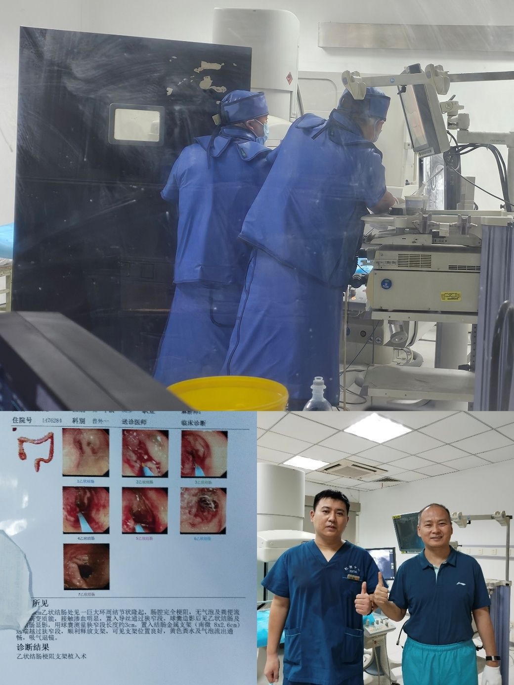 消化内二科与普外一科上演了一场与时间赛跑的生命救援。消化内二科张健副主任团队运用精湛技术,为一名82岁肝硬化合并脑梗、房颤乙状结肠癌及肠梗阻患者成功实施结肠支架植入术,帮助老人度过生命难关。