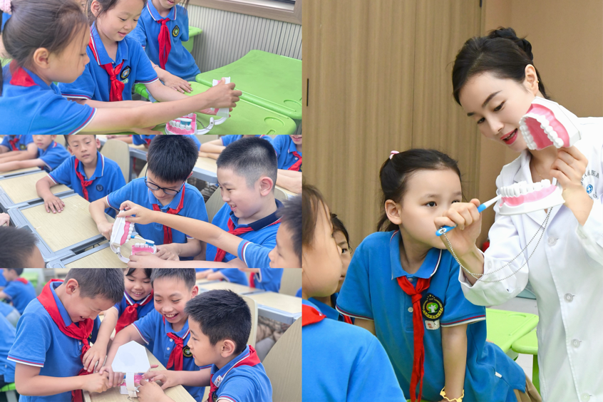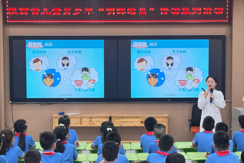 胡鑫主治医师以“认识我们的牙齿”为题,采用图文并茂的方式,向孩子们展示了牙齿的解剖结构及生理功能,讲解了学龄期龋齿、牙龈炎、牙外伤及错颌畸形的防治策略,并通过临床案例展示,直观呈现疾病发展过程及其对恒牙列的影响,帮助学生建立“早预防、早发现、早治疗”的健康理念。在实践环节,赵秦静护士现场演示了国际通用的“巴氏刷牙法”,详细解析刷牙角度、力度及顺序等关键要点,学生们在医护人员的指导下进行模拟练习。活动现场还设置了趣味问答环节,学生们就“窝沟封闭”“饮食习惯”等话题与医生进行互动交流。