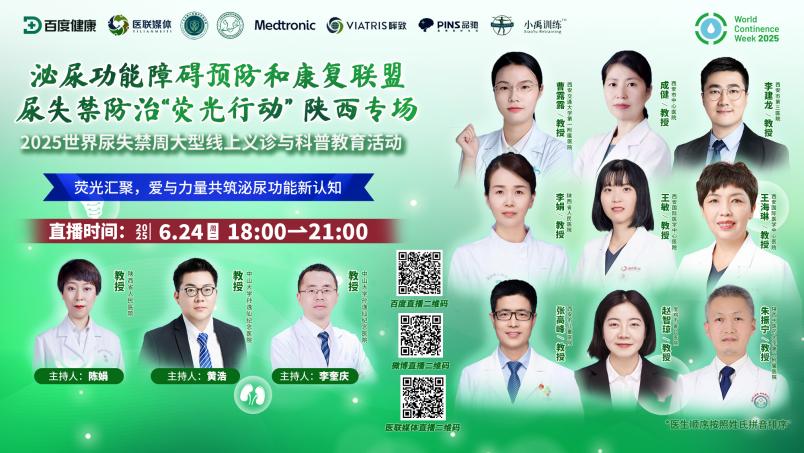 6月24日下午,由泌尿功能障碍预防和康复联盟发起主办的 “尿失禁防治‘荧光行动’陕西专场——2025世界尿失禁周大型线上义诊与科普教育活动” 顺利收官。直播吸引了百度、微博、医联媒体三大平台累计73367人次观看,为大众揭开泌尿健康“隐秘角落”的科学认知。