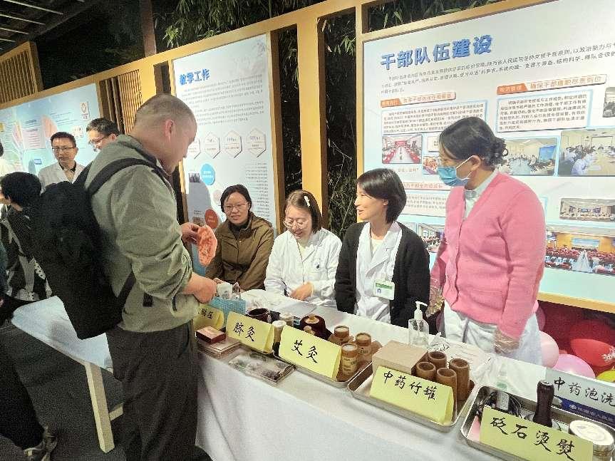 作为十周年活动亮点,“中医药文化夜市”于当晚拉开帷幕,让群众现场体验中医诊疗服务,感受中医文化魅力。医护人员表演了太极拳、八段锦功法,吸引众多患者及家属驻足观看与参与互动。现场设置了义诊区、中药标本展示区、中药文化及中医适宜技术体验区,提供肩颈推拿、针灸治疗、耳穴贴压、刮痧、中药贴敷等服务。在中药文化体验区,群众可参与中药猜谜、捣药体验,亲手制作中药香包和艾草药锤。根据节气时令,现场还提供菊花陈皮枸杞代茶饮,营造出浓厚的中医药文化氛围。