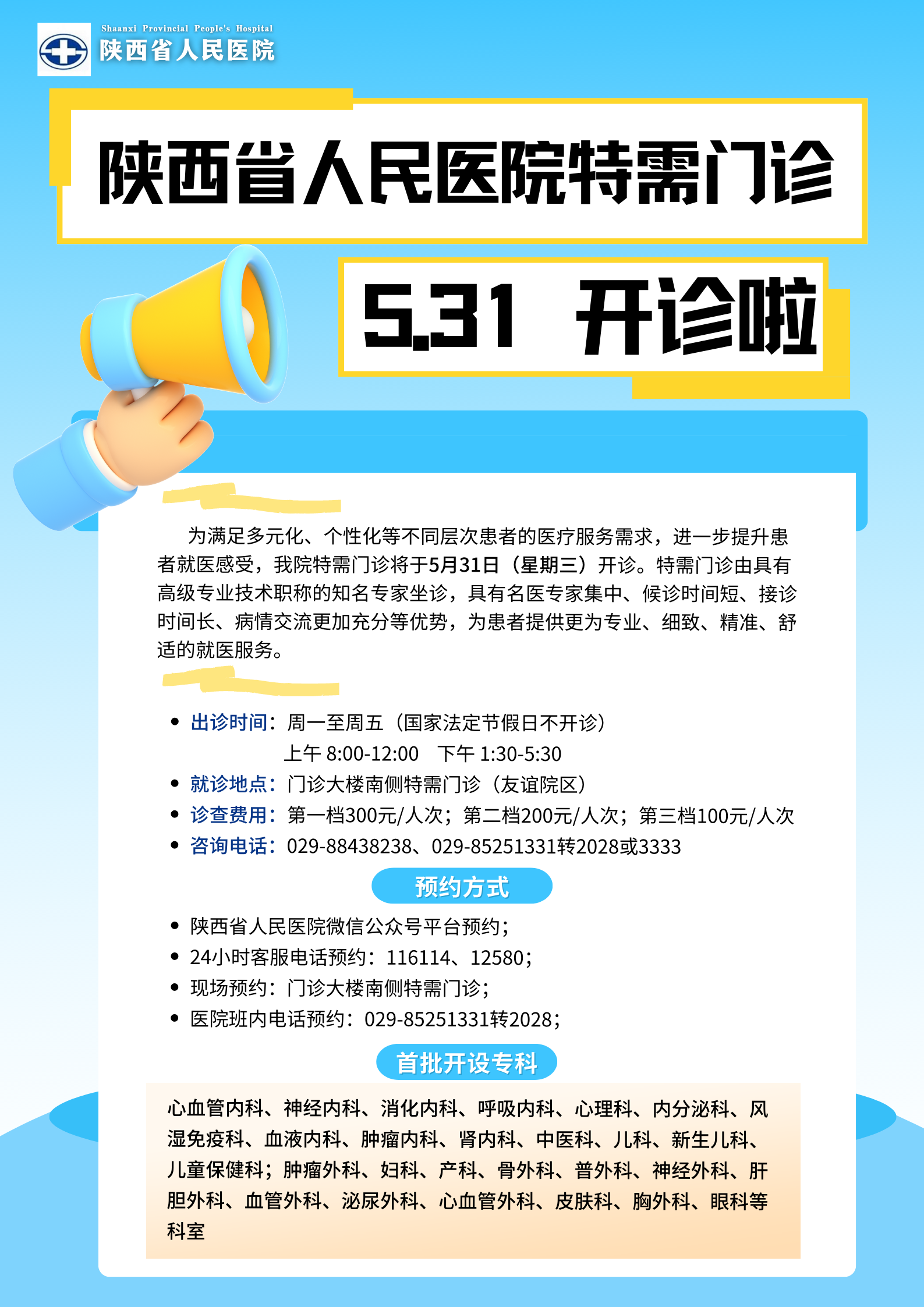 将于5月31日(星期三)开设特需门诊,由高年资专家团队出诊,一对一高品质服务,为您提供全新的就医体验。