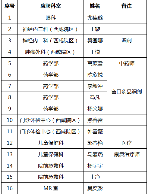 根据三级片 《关于招聘合同制临床医技类岗位工作人员公告》,在纪检监察处的全程监督下,经岗位公布、报名登记、资格初审、笔试、面试等程序,拟聘用尤佳璐等33人到三级片 工作,现将结果予以公示。