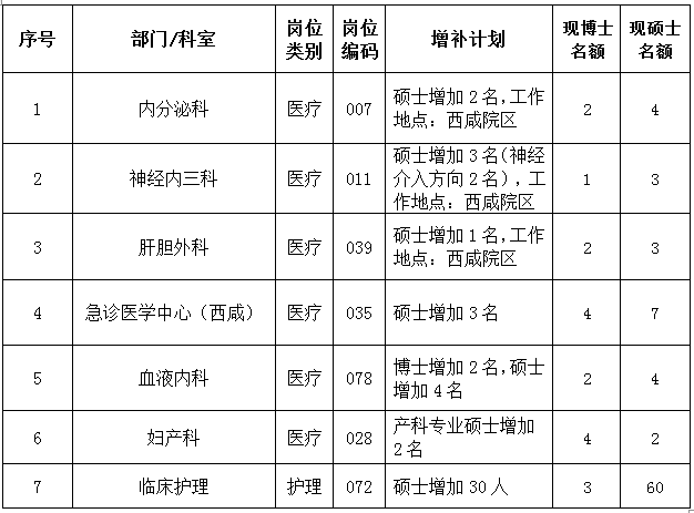根据医院学科建设和业务发展需要,经医院研究决定,在2023年12月13日发布的《三级片 2024年博硕士及高层次人才招聘公告》基础上,增加博硕士招聘岗位人数47名,其中招聘医疗岗位博硕士17名,护理岗位硕士30名。其他事宜与原公告保持不变,特此公告。增加岗位计划数详见附件。