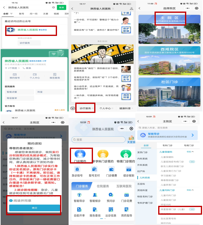 公众号→②点击诊疗服务→③选择主院区→④阅读预约须知→⑤点击门诊预约→⑥点击儿科系统选择体重管理门诊→⑦选择专家及预约时间段→⑧预约成功后记得在预约时间提前1小时支付取号哦!