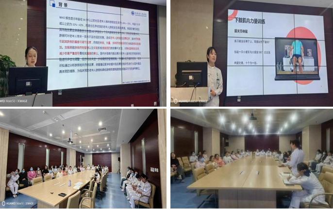 潘雅娟副护士长对老年人常见药物从易致患者跌倒的角度进行了深入解读,强调医护人员应加强老年人用药的规范化管理及风险的预警,避免药物相关性跌倒坠床问题的发生。老年专科护士郭璐沙对老年人下肢力量及平衡能力训练进行了详细讲解及视频演示,要根据患者病情及跌倒风险等级为患者定制个性化锻炼方案,由简到难,循序渐进,达到锻炼的目的。