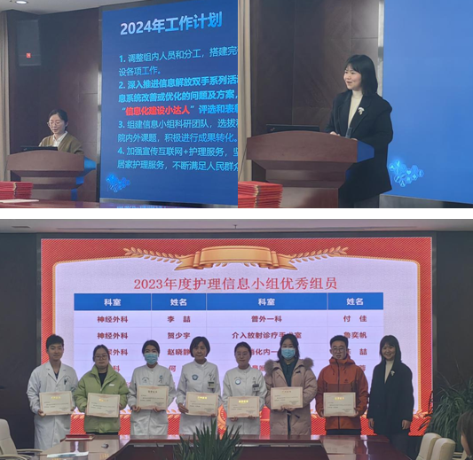 会上,8名小组长汇报了年度专项护理信息工作亮点和成果。李敏捷副组长对全年小组工作进行了总结。过去一年,护理信息小组在护理部带领下继续加强护理信息小组建设,开展三大核心能力评比活动,提升小组成员信息化应用能力;开发和完善信息系统功能,开展信息解放双手活动,运用信息技术提升护理工作效率;深入推进智能随访和“互联网+护理服务”,为患者提供延续性服务,改善就医体验;牵头成立陕西省临床护理联合会护理信息工作委员会,举办第五届长安临床护理管理创新暨高质量发展大会“互联网+护理服务”创新实践分论坛,发挥辐射引领作用;申报并获批护理信息化科研项目和标准立项,加强护理信息化科研创新;搭建护理信息推送和传播平台,调研信息系统功能,着力推进医院护理信息化建设。2024年小组将继续以提升临床护理工作效率和智能化水平为目标,加强护理信息小组核心能力提升为抓手,持续开展信息化培训、临床调研和改进、科研创新、辐射引领等作用。随后,进行了护理信息化建设座谈会,组员积极发言,共同为医院护理信息化的发展建言献策。护理信息小组组长、护理部主任助理刘红梅宣读了2023年度护理信息小组“三大技能”评比结果和优秀组员名单,鼓励大家在新的一年持续提升信息化理念,做医院信息化建设明亮的眼睛;提升信息效率,做临床与信息技术的桥梁;破解信息难题,做信息技术的推动者;提升信息化应用能力,做有特长的信息“达人”;扩大信息宣传,做重要信息的传播者;推动信息科研和创新,做信息技术的探索者。并对年度获奖者和先进个人进行了表彰,优秀组员代表进行了发言。