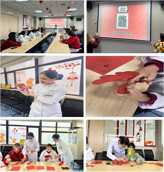 活动开始,主管护师王黎明为大家介绍了关于龙的生僻字。通过了解这些字,更好地传承和发扬中华民族的优秀文化。同时还安排了剪纸活动,一张张红纸、一把把剪刀,活跃在患者和家属手中,大家不仅体验到了传统艺术的魅力,还将自己的美好祝愿寄托在作品中,共同迎接新春的到来。