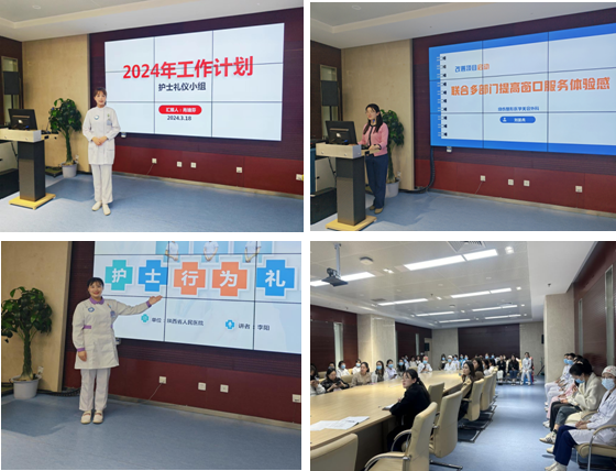 培训会上,肖培芬副护士长解读了2024年礼仪小组年度计划,鼓励大家积极参与小组活动,各科室礼仪教员以点带面,带动科室护士规范基础礼仪,树立医院形象,打造护理服务品牌。随后,礼仪小组副组长刘晏兵副护士长做2024年质量改善项目启动工作动员,从项目选题背景、主题选定、人员分工、活动计划拟定四个方面进行了汇报。礼仪小组副组长李阳副护士长做《护士行为礼仪》授课,从护士的仪容仪表、仪态举止、常用工作礼仪规范,如站姿、坐姿、走姿、蹲姿、远近距离指引、接打电话等进行了培训指导。