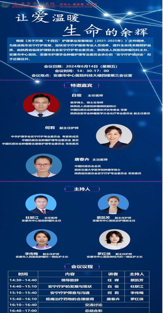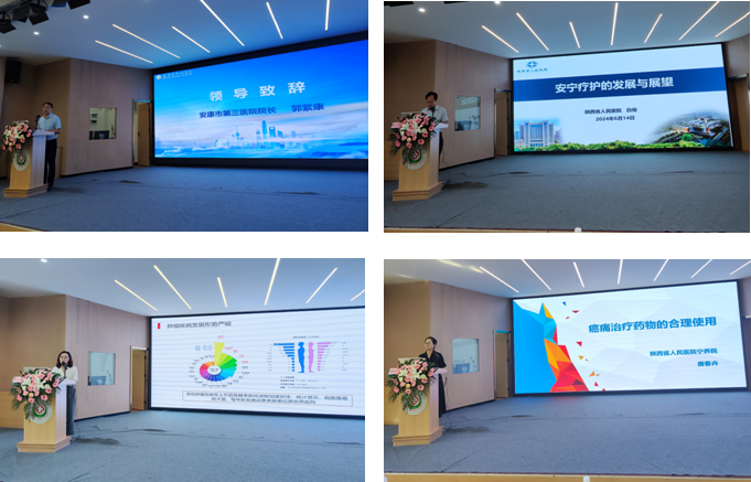 “我为患者办实事”主题党日活动方案,积极组织各支委讨论梳理,组织委员何莉提出陕西省临床护理联合会安宁疗护副主委单位安康市中心医院对安宁疗护相关专科业务有帮扶指导需求。支部及时与相关人员沟通交流,开展了以“党建引领走基层,精准帮扶送安宁”为主题的基层帮扶活动。6月14日,肿瘤病院副院长、肿瘤内科党支部书记白俊带领专业团队赴安康市中心医院开展了安宁疗护专题培训,安康市中心医院副院长郭紫康致辞,安康市中心医院肿瘤科主任杜联江与护理部主任蔡凯芳主持,相关科室医护200余人参加。