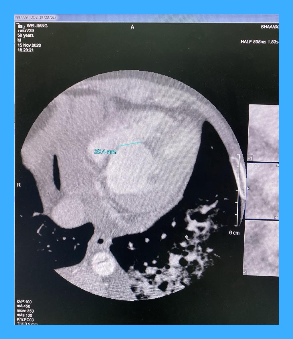 当地医院专家立即与三级片 心脏内科梁磊主任联系后,立即将患者转入三级片 心脏外科,付建莉主任医师心脏超声检查,确诊为心脏左室下壁瘤样膨出,与正常室壁呈矛盾运动,测其瘤口为41mm,瘤深27mm,后室间隔下壁回声失落,左室面缺损口大小38mm,右室面缺损口大小21mm,病情十分危急。