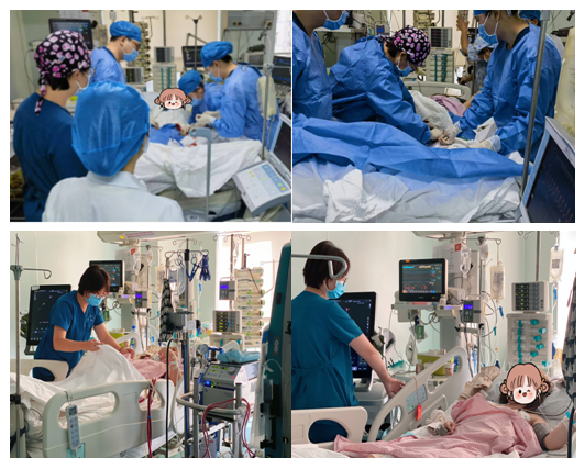 周五下午4点,从外院紧急联系转入一名心源性休克年轻女性患者,入科时使用血管活性药物维持血压,末梢循环差,超声提示心功能衰竭,乳酸高,快速在介入下置主动脉内球囊反搏治疗(IABP),暂时保证患者的冠脉血供。经过一夜的观察支持治疗,患者心功能仍然持续恶化,感染指标依然呈上升趋势。周六早上八点,宗媛主任立即汇报医务处,联系多专家、多学科团队组织线上讨论,一致认为患者病情危重,随时可能发生心源性猝死,必须行V-AECMO支持治疗。方案确定后,主治医生史晓娟第一时间与患者家属沟通,王艳副主任组织ECMO小分队开始准备上机,物品准备、预充仪器、管路穿刺,对患者进行心理疏导,专人守护……医护紧密配合,分工明确。