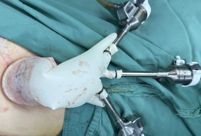 手术当天,甘露副主任医师在患者的肚脐位置仅做了一个3cm的切口,巧妙缜密自制机器人单孔PORT。在手术室李俊涛副护士长和器械护士张金团队的紧密配合下,机器人系统的机械臂通过这一单孔PORT进入腹腔,在米海平主任医师的全程操控下,切开子宫肌壁,暴露子宫肌瘤,剔除肌瘤,缝合子宫肌壁,一连串操作,精准流畅。最后将剔除的肌瘤套入取物袋中,由脐孔切割后取出。术后第1天,患者疼痛感较轻,已下床活动,康复快。同时由于利用了肚脐处的天然褶皱,实现了术后“无痕”的美观需求。
