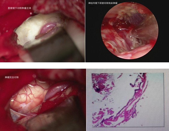 患者为中年女性,以面部疼痛症状入院,面对三叉神经痛为症状患者,经过检查,发现患者为右侧桥小脑角区长有一约4*1.5cm肿瘤。肿瘤沿桥小脑角间隙生长,最深部到达桥脑腹侧,包绕岩静脉、基底动脉、小脑上动脉、小脑前下动脉等重要血管和动眼神经、外展神经、面神经、听神经、舌咽神经等重要颅神经,桥小脑角区域解剖关系复杂,肿瘤沿缝隙生长,常规显微镜手术很难全切肿瘤。在缪星宇主任主持下,神经外科全科经过充分术前讨论后制定了精密诊疗方案,决定采用“双镜联合技术”切除肿瘤,这是国内部分先进医疗中心探索应用的技术,显微镜联合应用神经内镜,发挥最大优势;以显微镜清晰的三维成像为基础,利用神经内镜抵近观察和绕角观察的特性暴露深部肿瘤,既能发现并全切深部间隙隐藏肿瘤,又能在神经内镜直视下精准保护重要神经血管。手术由缪星宇主任医师、孟发财副主任医师、刘凯飞主治医师共同完成,经过5小时紧张有序的手术,血管神经保护良好,患者颅内肿瘤顺利全切,术后复查肿瘤全切,患者恢复良好出院。