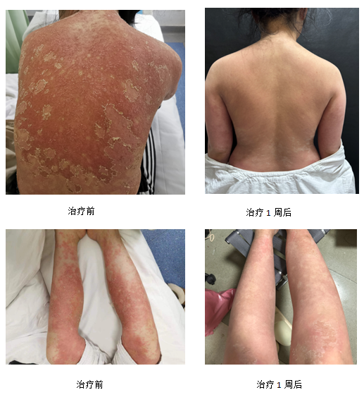 皮肤科就诊。门诊医生惠海英副主任建议患者即刻住院治疗。入院后,田军医生、杨帆医生给予患者紧急处理。入院后患者疾病诊断为泛发性脓疱型银屑病,为预防患者病情进一步加重,杨励副主任果断给予患者佩索利单抗生物制剂。同时,在张蕾副主任及科室护理团队的精心照料下,患者皮损及高热症状消退,1周后顺利出院。