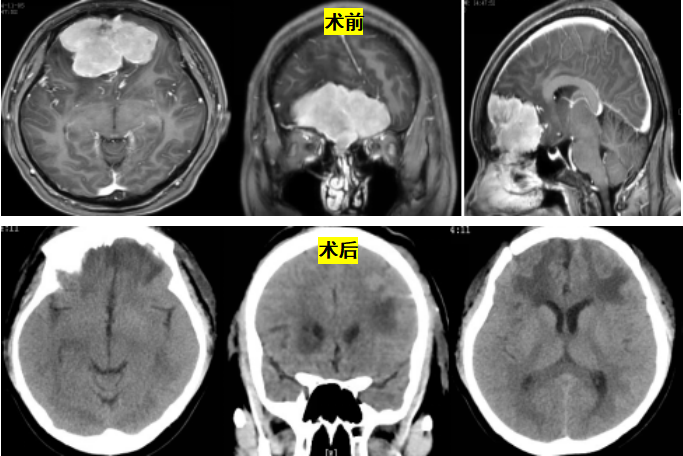 患者是一位以癫痫起病的年轻病人,经系统检查发现患者肿瘤位于额部前颅底区域,脑膜瘤可能性大,肿瘤大小约7.2x3.9x5.1cm,病变周围脑实质受压并大片水肿,侧脑室及中线结构受压,患者治疗意愿强烈。