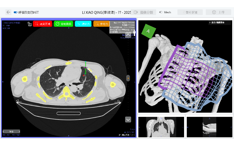 患者李先生既往在外院行经胸骨正中切口胸腺癌切除术,近期检查中发现双肺多发结节。其中左肺上叶结节距离胸膜下53毫米,肺结节直径约8毫米,且由于肺结节位置靠近大血管,常规肺穿刺技术容易出现大咯血等危及生命的并发症。胸外科团队仔细研究病情和影像资料,认为该肺结节为胸腺转移瘤可能性大,决定采用AI+AR导航技术穿刺定位方案进行手术。