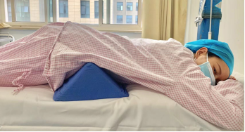 4、床上排便训练:仰卧位,双腿稍弯曲,做排便动作。术后需要绝对卧床休息24小时才能活动,只能在床上排尿。