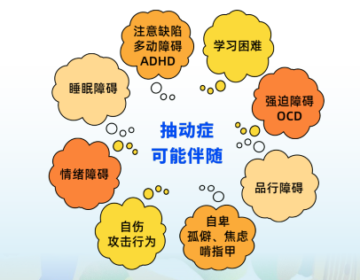 儿童TD除表现抽动外,约50%以上TD患儿和超过80%TS患者共患一种以上精神神经和行为问题,约60%TS患儿共患2种或以上共患病,如注意缺陷多动障碍(ADHD)、强迫行为/障碍(OCB/OCD)、睡眠障碍(SD)、情绪障碍(ED)、学习困难(LD)、焦虑障碍、抑郁障碍、自伤行为(SIB)、品行障碍(CD)、暴怒发作等。共患病增加了疾病的复杂性和严重性,影响患儿学习、社会适应能力、个性及心理品质的健康发展,给疾病的诊断、治疗和管理增添诸多困难和挑战。