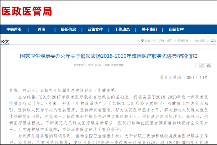 2021年1月21日,国家卫生健康委办公厅发布《关于通报表扬2018-2020年改善医疗服务先进典型的通知》,从改善医疗服务的5项工作制度和10项创新举措等15个方面,对全国范围内的先进典型医院、科室及个人进行通报表扬,并号召全国卫生健康系统以先进典型为榜样,坚决贯彻党中央、国务院决策部署,坚持以人民为中心,扎实推动改善医疗服务工作再上新台阶,不断推进医疗卫生服务体系高质量发展。