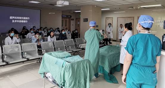 培训中,周娇副护士长讲解了操作理论要点,带领护士李佳和范小青演示了手术衣、口罩及帽子的正确穿戴方法、术中无菌手套的无接触佩戴方式,对超声科常用的肝脏及甲状腺微波消融的无菌操作和消毒铺巾进行了规范化演示。医护人员积极参与,认真学习,不仅提高了自身的无菌操作技能,也增强了对无菌操作重要性的认识。