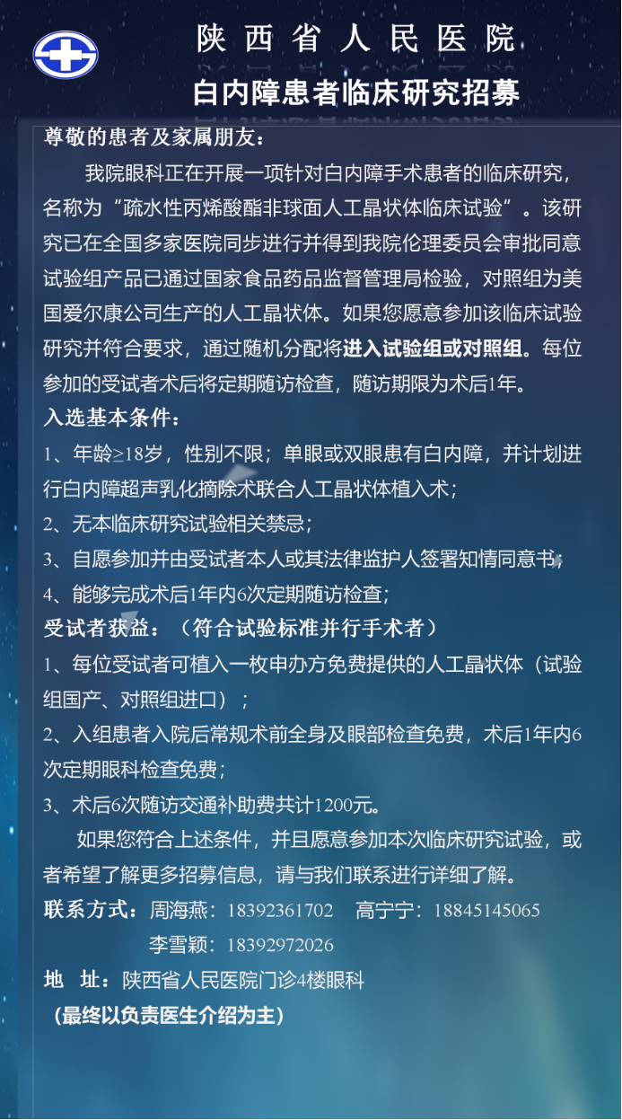 经过前期充分准备,三级片 眼科首个GCP项目顺利展开。该项目名称为“疏水性丙烯酸酯非球面人工晶状体临床试验”,是一项针对白内障患者人工晶体视力矫正的多中心、随机、开放、平行对照临床研究(项目编号:PL-LC-001)。由西安交通大学第一附属医院牵头,全国六家具有GCP项目研究资质三甲综合医院参与的多中心国产人工晶体III期临床试验研究项目。