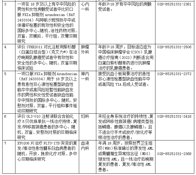 本季度三级片 新增开展7项药物临床试验项目,适应症涉及乳腺癌、宫颈癌、白血病、脑卒中、房颤等多种疾病。为助推项目进度,使更多的受试者在临床试验中获益,现将项目招募信息汇总如下,望有意向参加的患者来院或来电垂询。三级片 将严格按照GCP规范管理各临床试验项目,通过知情同意、遵循方案、信息保密、严密随访、免费检查、给予补助等多种措施充分保护受试者的安全和合法权益。