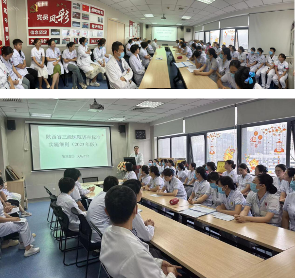 眼科在张坚主任的组织下,组建等级医院复审眼科工作小组,在周海燕副主任主持下开展全方位迎检自查。通过对《陕西省三级医院评审标准实施细则(2023年版)》第一部分前置要求进行逐项解读,梳理出与临床相关指标,针对相关条款和得分点做详细解析,并围绕每期《等级复审应知应会》展开,确保迎查自查顺利进行。全科人员在科室主任和护士长的带领下,认真整理相关资料对以往工作进行梳理总结,并温故知新,对科室各项工作的开展有了新的见解。眼科将不断巩固整改效果,建立健全常态化自查与改进机制,以自查活动为重要抓手,以推动条目落地见效为着力点,以巩固提升护理水平为落脚点,助力医院评审工作顺利通过。
